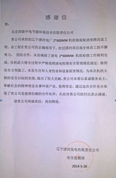在公司總部的正確領導下,經過遼寧清河電廠2*600MW機組脫硫取消旁路改造工程項目部全體員工的共同努力,確保了該工程業主安全目標的順利實現,受到業主公司安全監察部表揚,也充分體現了我們國能中電是值得信賴的合作伙伴。